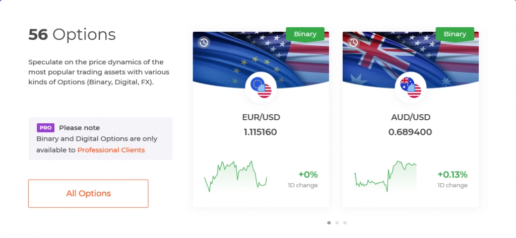 Eles oferecem aos clientes uma vasta gama de instrumentos de negociação em várias classes de ativos, incluindo Opções de FX e CFDs em Forex, Ações, Criptomoedas, Commodities, Índices e ETFs.
